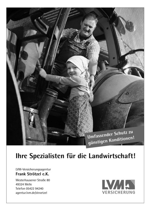 Umfassender Schutz zu günstigen Konditionen! Ihre Spezialisten für die Landwirtschaft! LVM-Versicherungsagentur Frank Strötzel e.K. Westerhausener Straße 80 49324 Melle Telefon 05422 94240 agentur.lvm.de/stroetzel