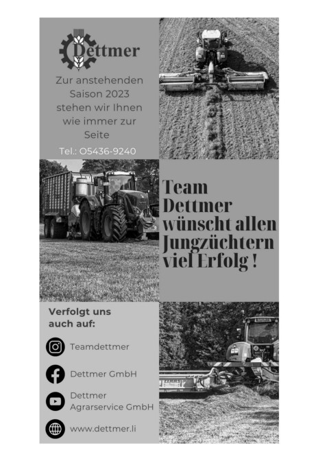 Zur anstehenden Saison 2023 stehen wir Ihnen wie immer zur Seite Tel.: O5436-9240 Team Dettmer wünscht allen Jungzüchtern viel Erfolg ! Verfolgt uns auch auf: Teamdettmer Dettmer GmbH Dettmer Agrarservice GmbH www.dettmer.li